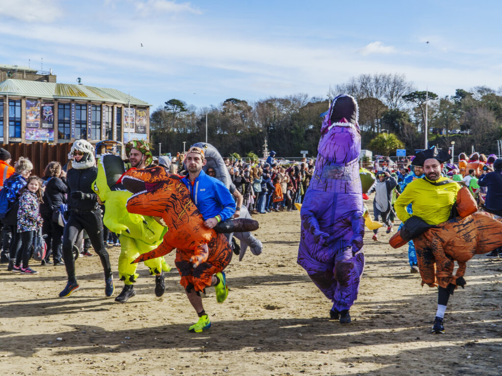 What a way to start the season in Weymouth! Today’s Dino Race brought colour, crowds and more than 320 participants to the seafront, with runners of all ages donning inflatable dinosaur suits and racing along the beach in front of hundreds of spectators.